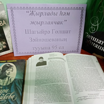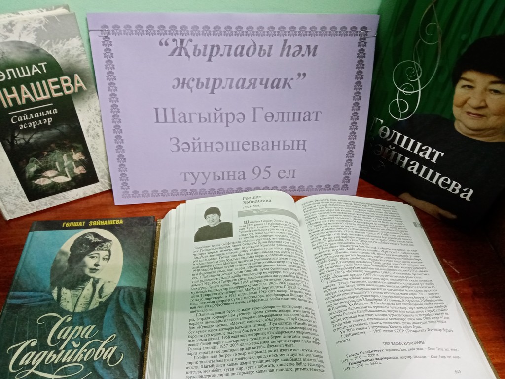 13 января в Суксинской сельской библиотеке была организована тематическая книжная выставка «Пела и будет петь», в честь 95-летия со дня рождения татарской поэтессы, автора сотен известных песен, драматурга, лауреата Государственной премии РТ им. Г. Тукая Гульшат Зайнашевой. Вниманию читателей были представлены книги Г.Зайнашева: «Сайланма әсәрләр», «Сара Садыйкова», «Гөлшат Зәйнашева» и книга «Әдипләребез», которая познакомила читателей с творчеством заслуженного деятеля Республики Татарстан. Библиотекарь провела обзор книжной выставки и вкратце рассказала о жизни и творчестве поэта.