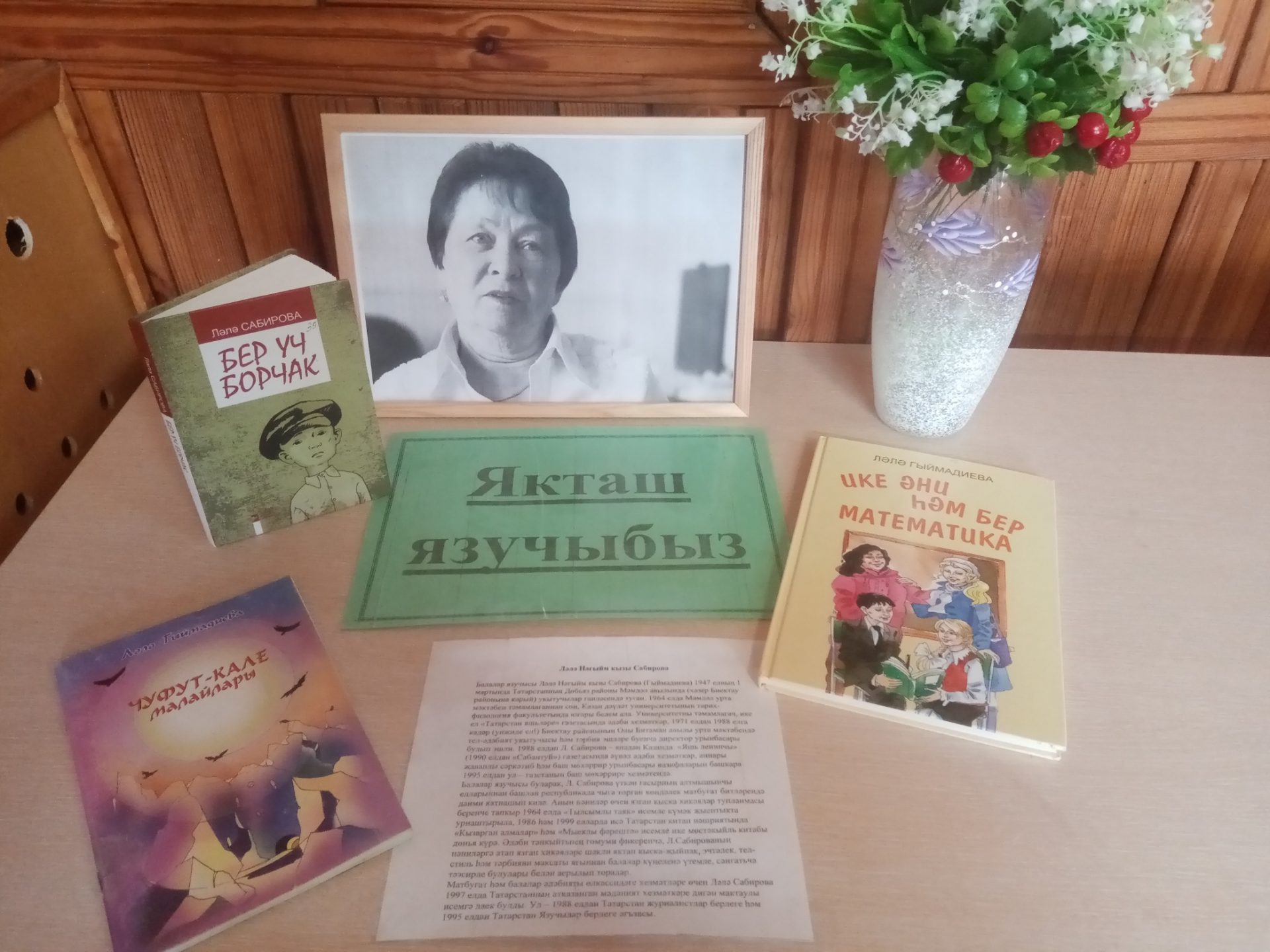 Сегодня нашей землячке, детской писательнице, журналисту, заслуженному работнику культуры РТ -Ляле Нагимовне Сабировой (Гимадиевой) исполняется 76 лет. К этому событию Юртушская сельская библиотека организовала книжную выставку «Наш писатель- земляк».На этой выставке читатели познакомились с ее творчеством и жизненным путем. В ее произведениях поднимаются вопросы нравственного воспитания детей и молодежи. В фонде Юртушской сельской библиотеки имеютя такие книги автора : «Чуфут-кале малайлары», «Ике әни һәм бер математика », «Бер уч борчак», «Рәхәткә чыдап кара».