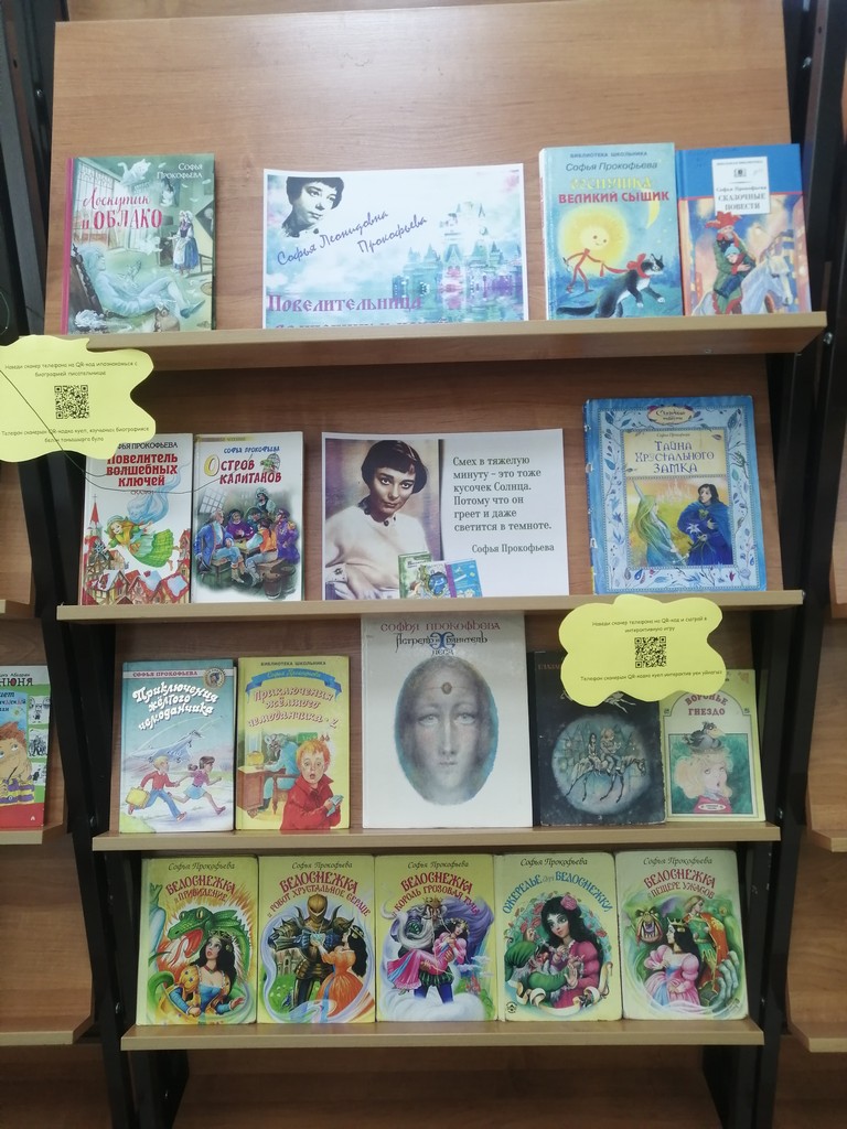 16 мая 2023 года в Центральной детской библиотеке открылась книжная выставка «Повелительница волшебных ключей», посвященная 95 -летию со дня рождения писательницы, автора замечательных детских сказок Софьи Львовны Прокофьевой. На выставке представлено богатое и разнообразное творчество Софьи Прокофьевой. Это и пять повестей, объединенных в цикл «Повелитель волшебных колючей». И занимательная история о докторе, лечащем трусость, грусть и лень – книга «Приключения желтого чемоданчика». И красивая увлекательная сказка о дружбе бедной девочки с волшебным облаком «Лоскутик и облако». И другие произведения писательницы, которые понравятся читателям разных возрастных групп. Наведя сканер телефона на QR-код, можно будет познакомиться с биографией писательницы и сыграть в интерактивную игру по ее произведениям.