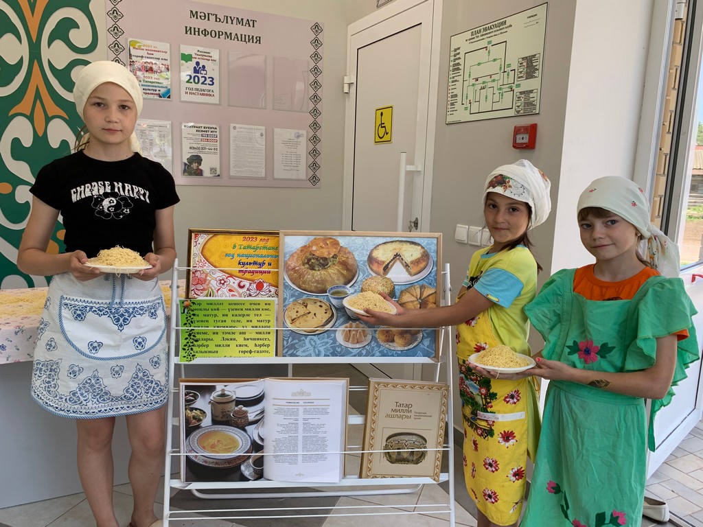 В Татаро-Айшинской сельской библиотеке прошел мастер-класс по приготовлению и нарезке татарской лапши. Библиотекарь рассказала детям, что  домашняя лапша — это традиционное блюдо татарской кухни, которое подается в качестве основного блюда. Относится к разряду популярных блюд, и готовится как в праздничные, так и будничные дни.  Домашняя лапша, приготовленная своими руками, не сравнится даже с самой лучшей купленной. А готовить ее совсем несложно, нужно просто проявить немного терпения, уделить этому немного времени, Чем тоньше нарезана лапша, тем выше мастерство. Искусству приготовления лапши девочек учили с 4-5 лет, как только она начинала помогать маме по хозяйству.