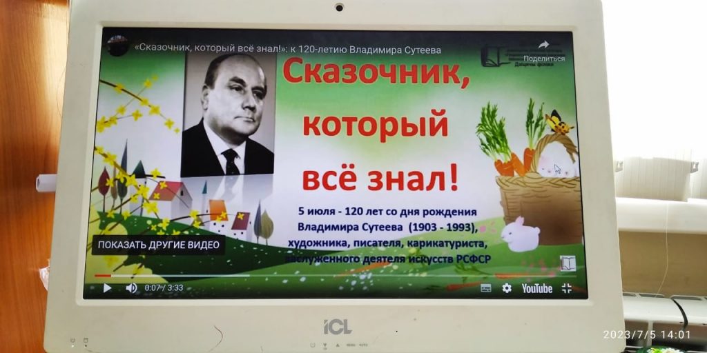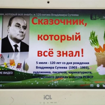 5 июля исполняется 120 лет со дня рождения писателя, художника–иллюстратора и режиссера–мультипликатора Сутеева Владимира Григорьевича. К этой дате в Усадской сельской библиотеке детям был организован показ презентации под названием «Сказочник, который все знал». Ребята познакомились с творчеством писателя, а также, что остроумные, веселые, добрые книжки этого замечательного писателя знакомы детям всего мира. Ими восхищаются взрослые люди, перечитывая и пересматривая их вместе со своими детьми и внуками, не уставая восторгаться творчеством доброго сказочника.