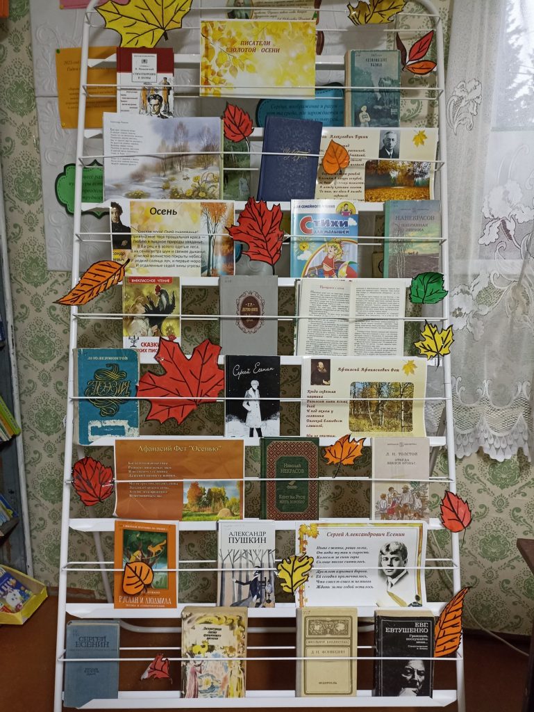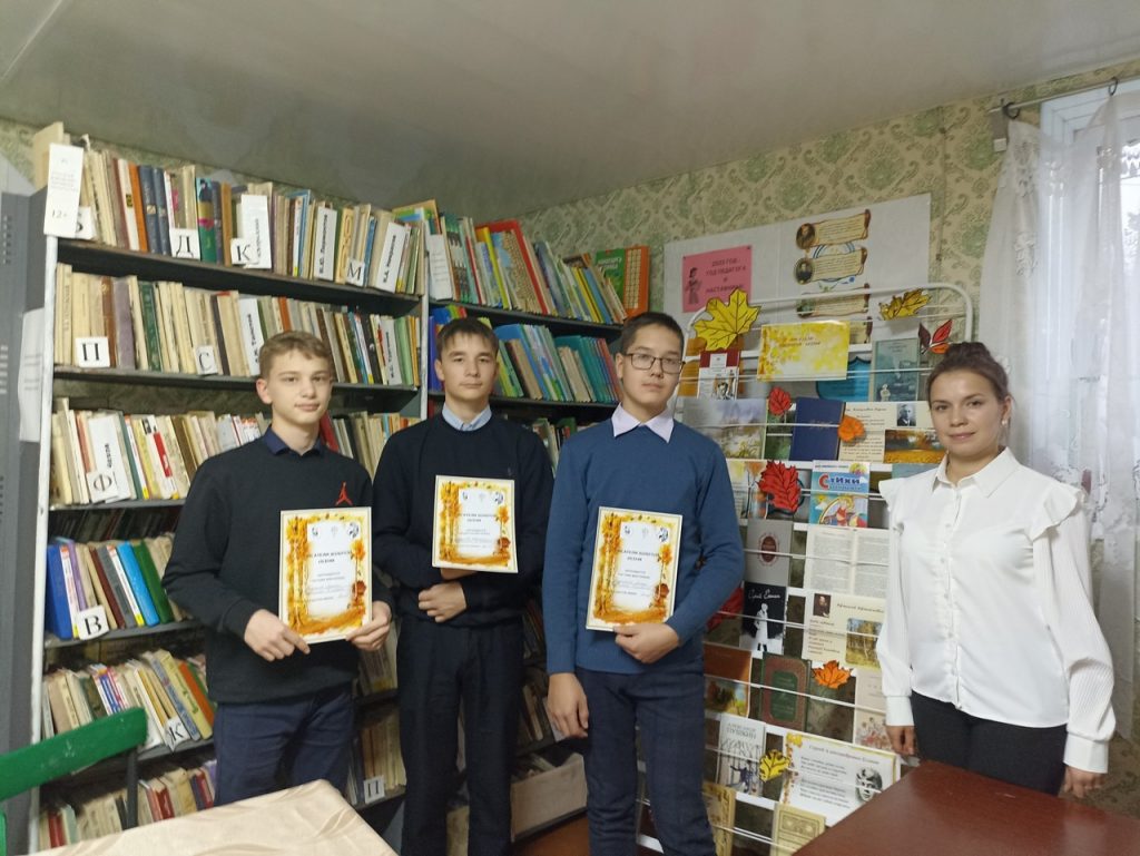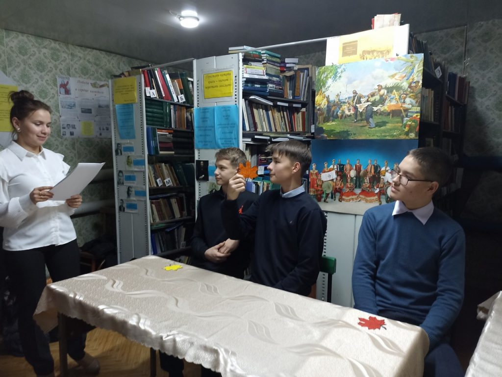 В стенах Берёзкинской сельской библиотеки в рамках проекта «Пушкинская карта» для учеников 9 класса прошло мероприятие «Писатели золотой осени». Мероприятие началось с обзора книжной выставки, на которой представлены книги поэтов и писателей про самое богатое и гармоничное время года- Осень. Далее мероприятие продолжилось в форме викторины и обзором презентации. Каждому читателю был вручен кленовый лист. Библиотекарь зачитывала вопрос и предлагала варианты ответов, по готовности читатели поднимали лист, отвечали на вопрос и получали баллы. Мероприятие получилось очень интересным и насыщенным. В завершении мероприятия прозвучал романс на стихотворение Сергея Есенина. Все присутствующие получили грамоты.