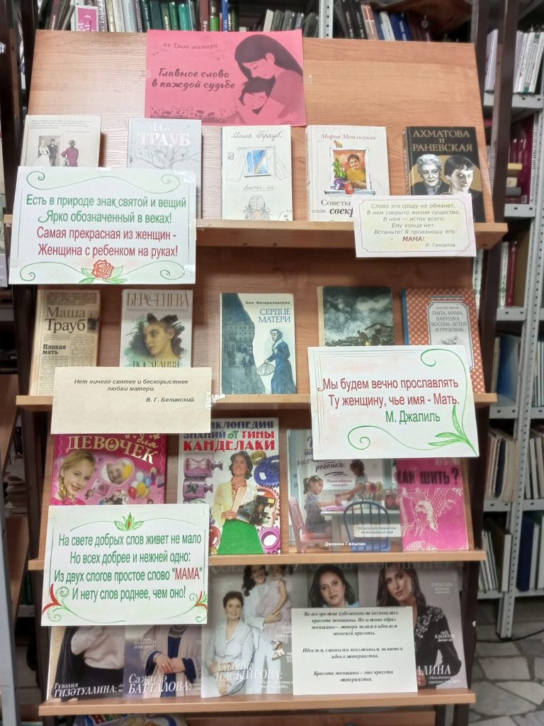 День матери – один из самых теплых праздников, посвящённый самым близким и дорогим сердцу людям – нашим мамам. Ко Дню матери, в Высокогорской сельской библиотеке была оформлена книжная выставка «Главное слово в каждой судьбе», на которой представлены книги отечественных и зарубежных авторов, которые заставляют взглянуть другими глазами на своих мам, понять какую важную роль они играют в нашей жизни. Так же книжная выставка дополнена душевными цитатами и трогательными стихотворениями о самом главном человеке в жизни каждого.