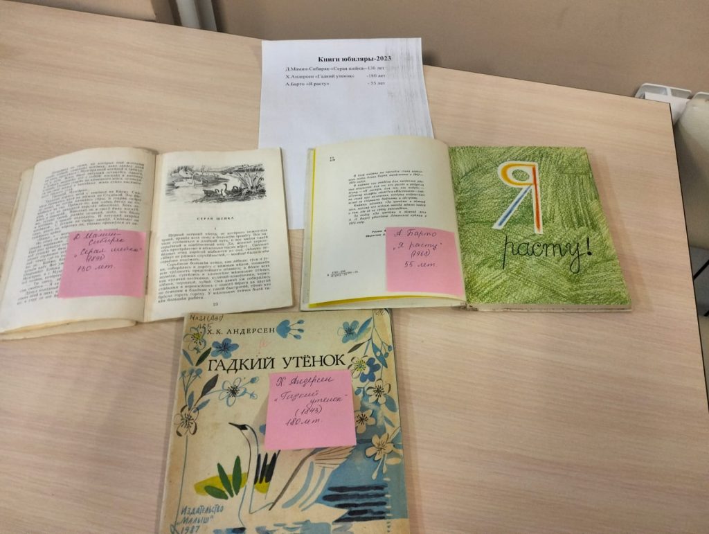 26 ноября в Казакларской сельской библиотеке была организована выставка «Книги-юбиляры», на которой были представлены книги, посвященные юбилейным датам 2023 года.Памятные даты отмечают не только люди,но и города.У каждой книги свой характер,своя судьба, свой путь к читателю.В этом году исполнилось 180 лет со дня выхода книги Х. Андерса «Гадкий утенок». Сначала кратко ознакомились с жизнью и творчеством писателя,потом прочитали сказку,также читатели получили книги: Д. Мамина-Сибиряка «Серая шейка»-(130 лет),А. Барто «Я расту» –(55 лет).