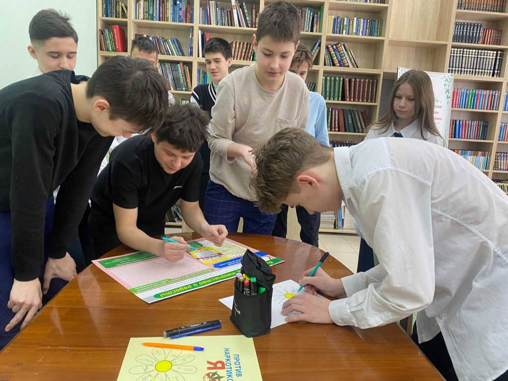Центральную библиотеку посетили учащиеся 8 «И» класса ВСОШ №1 с преподавателем В.А.Капитоновой. Они были приглашены на час здоровья «НЕТ-наркотикам». Мероприятие было приурочено к Международному дню борьбы с наркоманией и незаконным оборотом наркотиков, который был провозглашён в 1987 году. Проблема наркомании является одной из наиболее актуальных как для здравоохранения, так и для общества в целом. По данным исследований, во всем мире критическим периодом в плане приобщения к психоактивным веществам является период с 12 до 14 лет. Такого возраста ребята и присутствовали на мероприятии. Для них был продемонстрирован видеоролик о важности выбора пути здоровья, успеха, а не трагического – наркомании. Затем предстояло пройти онлайн-тесты в сервисе LearningApps, чтобы закрепить свои знания в игровой форме. Все дружно принимали участие, дополняли друг друга и самые активные получили презенты. Для мероприятия была подготовлена тематическая книжная выставка, с которой ознакомились участники. Главное – это выводы ребят о том, что эксперименты с наркотиками всегда заканчиваются ущербом для себя и никогда не проходят бесследно для психики и тела. Важно ни под каким предлогом, ни под каким видом, ни из любопытства, ни из чувства товарищества, ни в одиночку, ни в группе, не принимать наркотики. В заключении все поставили подписи на символических ромашках «Я против наркотиков».