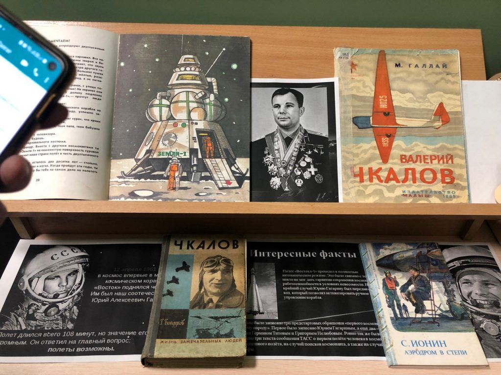 Библиотекарь подготовила беседу, наполненную интересными фактами о полете Юрия Гагарина и книги: А. Митяев «Сегодня праздник», М. Галлай «Валерий Чкалов», Г. Гайдуков «Чкалов, жизнь замечательных людей», С.Ионин «Аэродром в степи»,заинтересовавших детей. Ребята, пришедшие на выставку с особым интересом вчитывались и задавали вопросы.