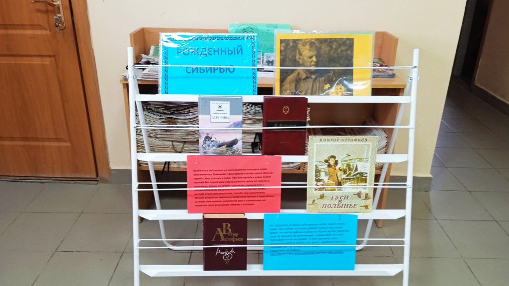 К 100 летию певца Сибирской природы Виктора Астафьева в Усдской сельской библиотеке оформлена книжная выставка под названием «Рождённый Сибирью».  Виктор Астафьев – выдающийся современник, ставший еще при жизни писателем-классиком. Его судьба была полна трудностей и лишений. Рассказы писателя, особенно написанные для детей, носят биографический характер. Проза Виктора Астафьева реалистична и посвящена непростой жизни человека-труженика, отражает взгляды и деревенский быт жителей Сибири и Урала, отличается живым и выразительным языком. Об этом и многом другом читатель сможет найти на книжной выставке.