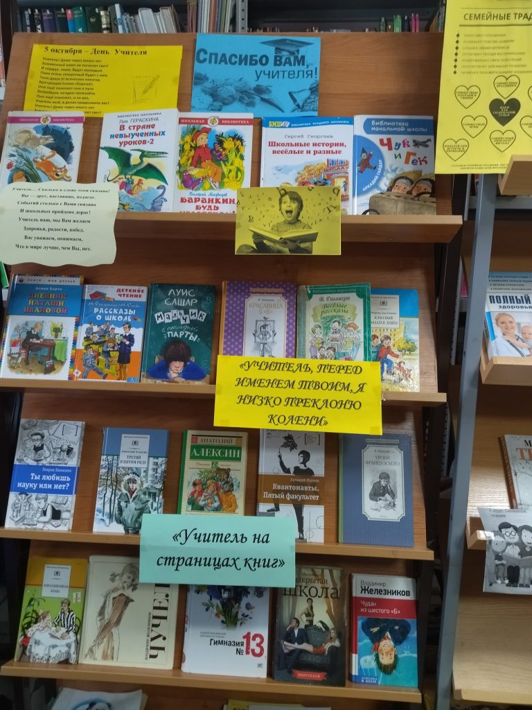 В октябре педагоги отмечают свой профессиональный праздник – День учителя. К этому дню Высокогорская сельская библиотека подготовила книжную выставку «Спасибо Вам, учителя!». На выставке представлены художественные произведения русских, советских авторов о школе: В. Распутин «Уроки французского», Г. Полонский «Доживём до понедельника», В. Астафьев «Фотография, на которой меня нет», В. Железников «Чучело», «Чудак из 6 «Б», Т. Крюкова «Невыученные уроки», «Повторение пройдённого» и много других интересных произведений. Библиотекарь провела беседу с читателями о школьной жизни и сделала обзор представленной на выставке литературы.