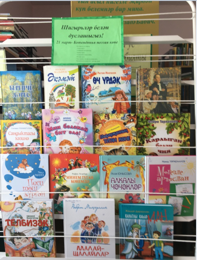 21 марта отмечается Всемирный день поэзии. К этой дате в Большебитаманской сельской библиотеке оформлена книжная выставка, где представлены книги детских поэтов. Здесь можно будет увидеть книги М. Джалиля, Г. Тукая, Р. Миннуллина, Р. Курбана, Н. Ахмадиева и многих других детских поэтов. Выставка позволяет прикоснуться к чарующим силам поэтического дара татарских поэтов. Она не только познакомит сборниками поэтов, но и дает возможность поразмышлять, насколько беднее была бы жизнь без поэзии. Ведь именно стихи способны развить умение образно видеть мир и понимать его многогранность, помочь воспитать чувство сострадания, любви. Посетив выставку, каждый юный читатель смог выбрать книгу своего любимого поэта.