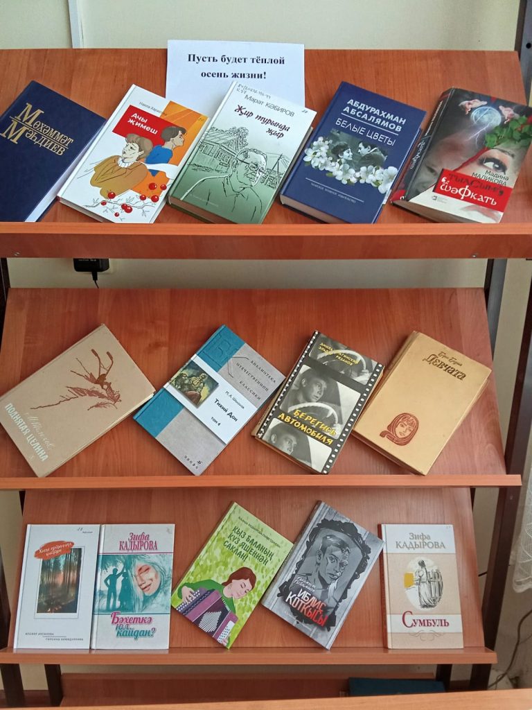 Каждый год в октябре проходит Декада пожилых людей. Для читателей пожилого возраста  за их преданность книге, чтению и библиотеке, была оформлена книжная выставка «Пусть будет теплой осень жизни». На выставке  постарались наиболее полно отразить книжные пристрастия наших уважаемых читателей. Выставка знакомила с художественной литературой на русском и татарском языках, с последними новинками книжной продукции поступившей в библиотеку, а так же отраслевой литературой. На выставке были представлены произведения: А. Абсалямова, М. Магдеева, М. Маликовой, З. Кадыровой, М. Шолохова, В. Шукшина, К. Симонова.