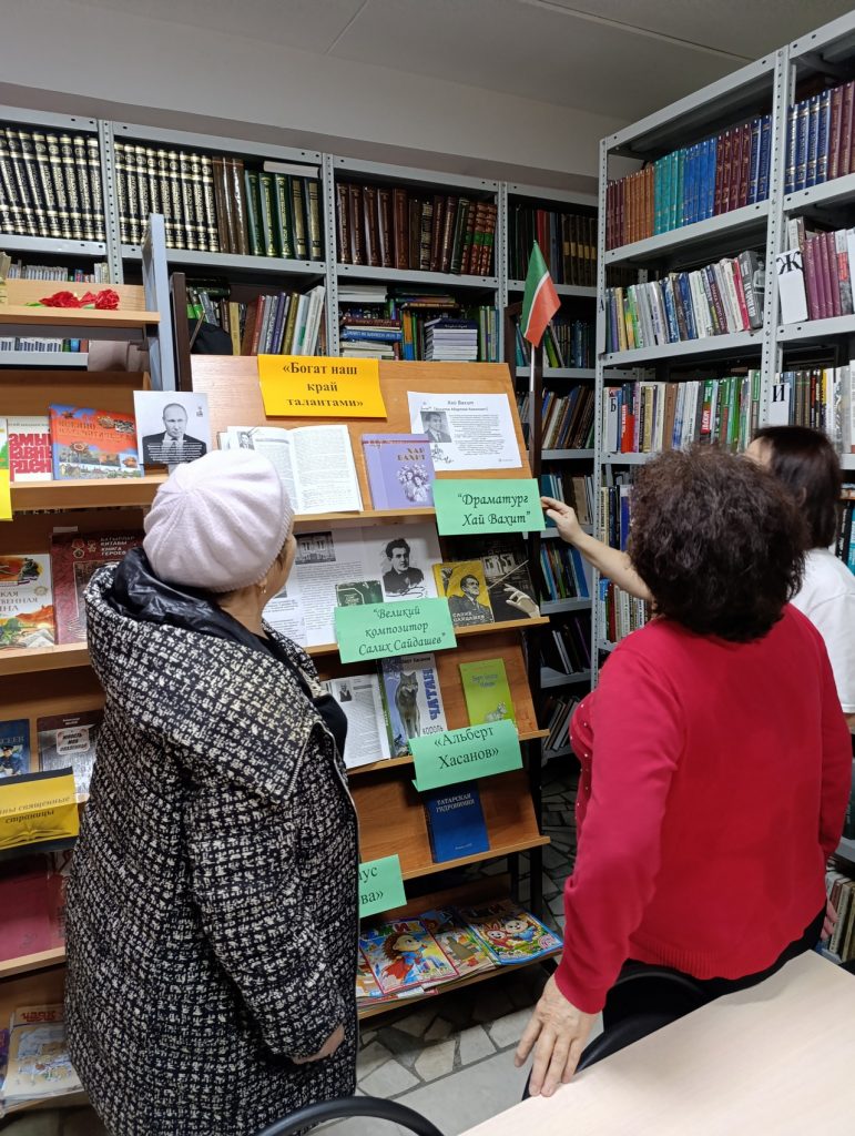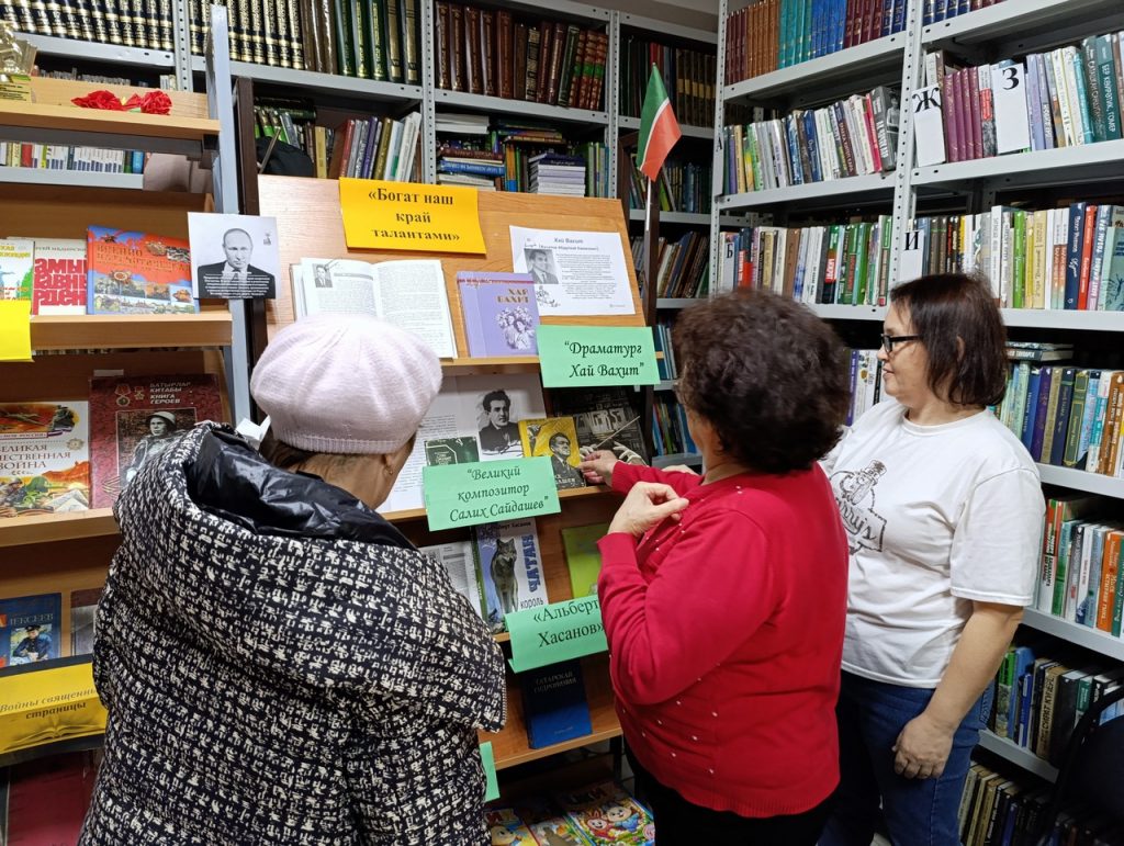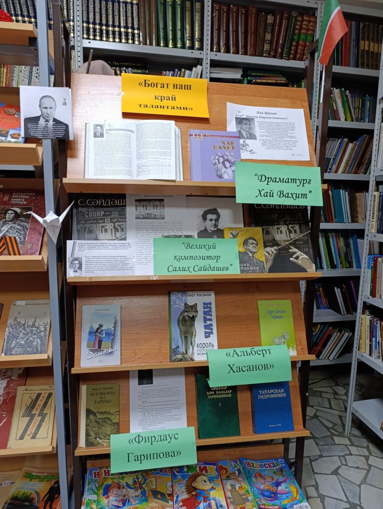 В сельской библиотеке открылась книжная выставка «Богат наш край талантами». У нашего района, как и у каждого уголка земли, своя история и память о людях, прославивших свой край. Жители нашего района по праву могут гордиться земляками, которые являются признанными деятелями современной литературы и искусства не только Республики Татарстан, но и далеко за её пределами. На выставке представлены книги о знаменитых людях Высокогорского района. Творчество земляков очень разнообразно, но их объединяет любовь к своей земле, к своему краю. Библиотекарь познакомила читателей с биографией и творчеством С.Сайдашева, А.Хасанова, Ф.Гариповой, Х.Вахита.