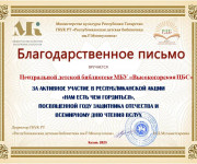 Үзәк балалар китапханәсе Ватанны саклаучылар елына һәм Бөтендөнья кычкырып уку көненә багышланган «Безнең горурланыр нәрсәбез бар» республика акциясендә катнашты. Чарада Татарстан язучылары һәм шагыйрьләре Муса Җәлил Фатих Кәрим, Абдулла Алиш, Гадел Кутуй, Нур Баян әсәрләре яңгырады .