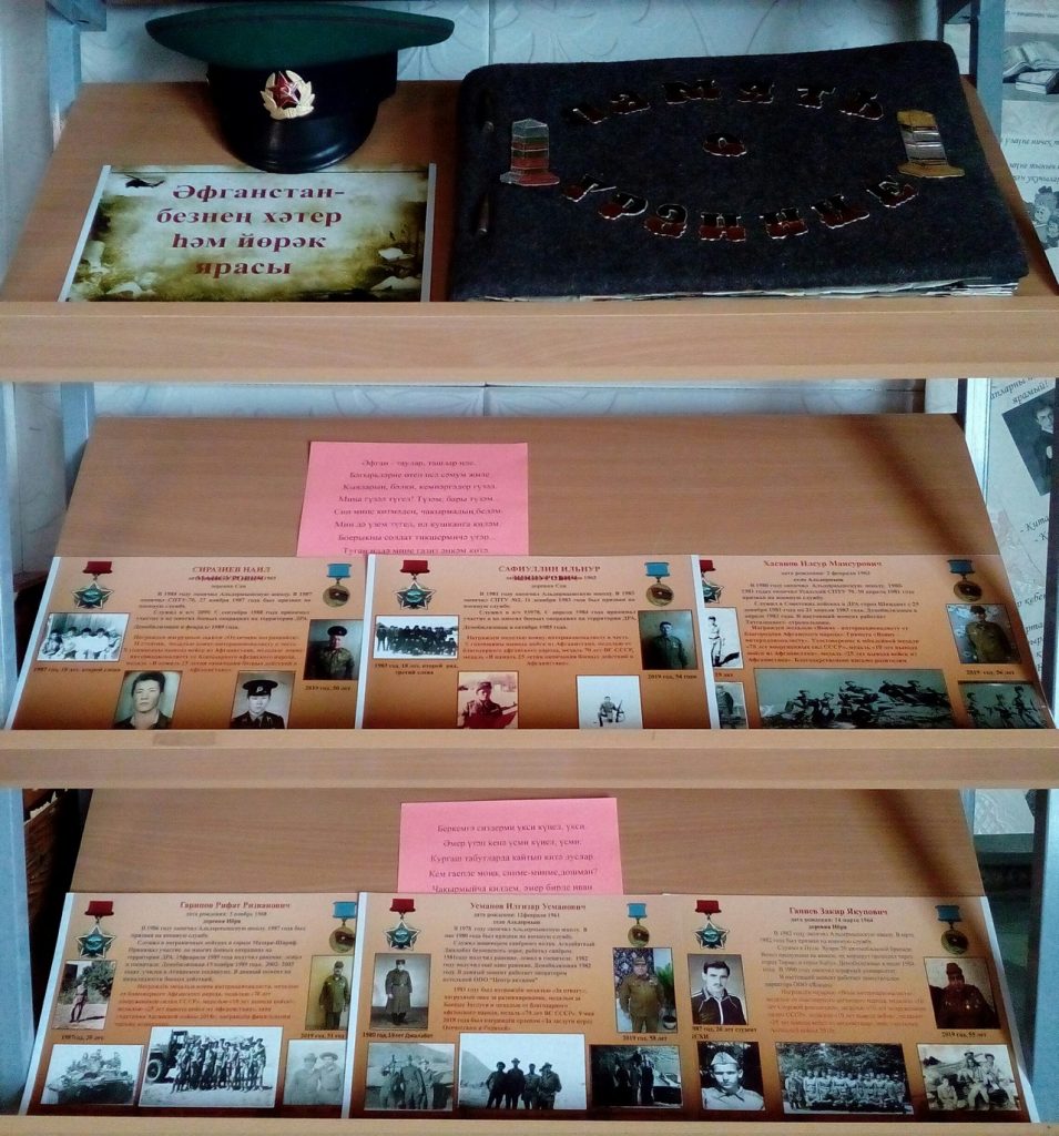 15 февравль Ватаныбыз тарихында әһәмиятле вакыйга – Совет гаскәрләрен Әфганстаннан чыгаруны билгеләп үтә. Бу көн һәлак булганнарны искә алу гына түгел, ә бәлки үзенең хәрби һәм гражданлык бурычын намус белән батырларча үтәп кайтучыларны да данлау. Шул максаттан китапханә китап укычылар игътибарына «Әфган кызалаклары» дип исемләнгән китап күргәзмәсе тәкъдим ителде.