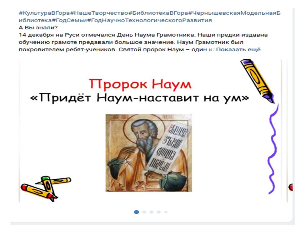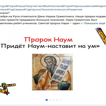 Чернышевка авыл китапханәсе грамоталык көненә онлайн-презентация әзерләде. Безнең бабаларыбыз укытуга зур әһәмият биргәннәр. Русиядә Наум пәйгамбәрне укучыларның яклаучысы дип санаганнар. Халыкта укуга ихтирам белән караганнар, ә укытучыларны аеруча хөрмәт иткәннәр, аның эшен мөһим һәм авыр дип санаганнар. Киапханәнең битенә кереп Наум пәйгәмбәрнең кем булуы һәм Русиядә грамоталыкның ничек барлыкка килүе турында мәгълүмат