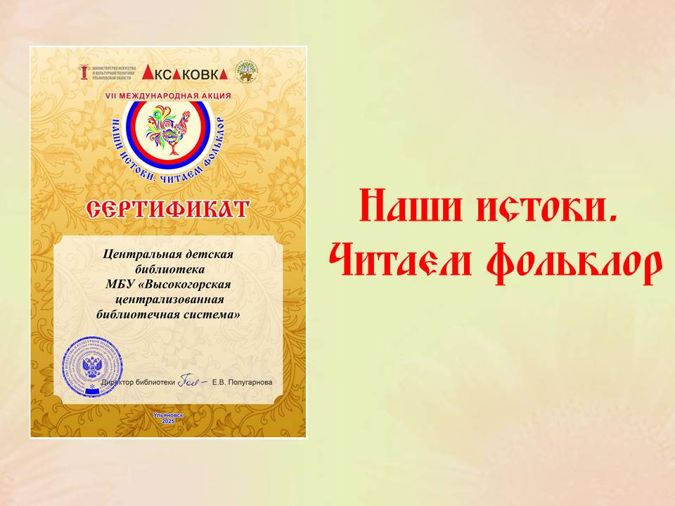Үзәк балалар китапханәсе « Безнең чыганаклар. Фольклорны укыйбыз» акциясендә катнашты.  Акциянең максаты яшь буынга фольклорны өйрәнү һәм популярлаштыру юлы белән төрле халык, мәдәният, башка вәкилләргә карата ихтирам һәм игелек тәрбияләү. Оештыручысы ОГБУК «С.Т. Аксаков исемендәге Ульяновск өлкә балалар һәм яшүсмерләр китапханәсе».