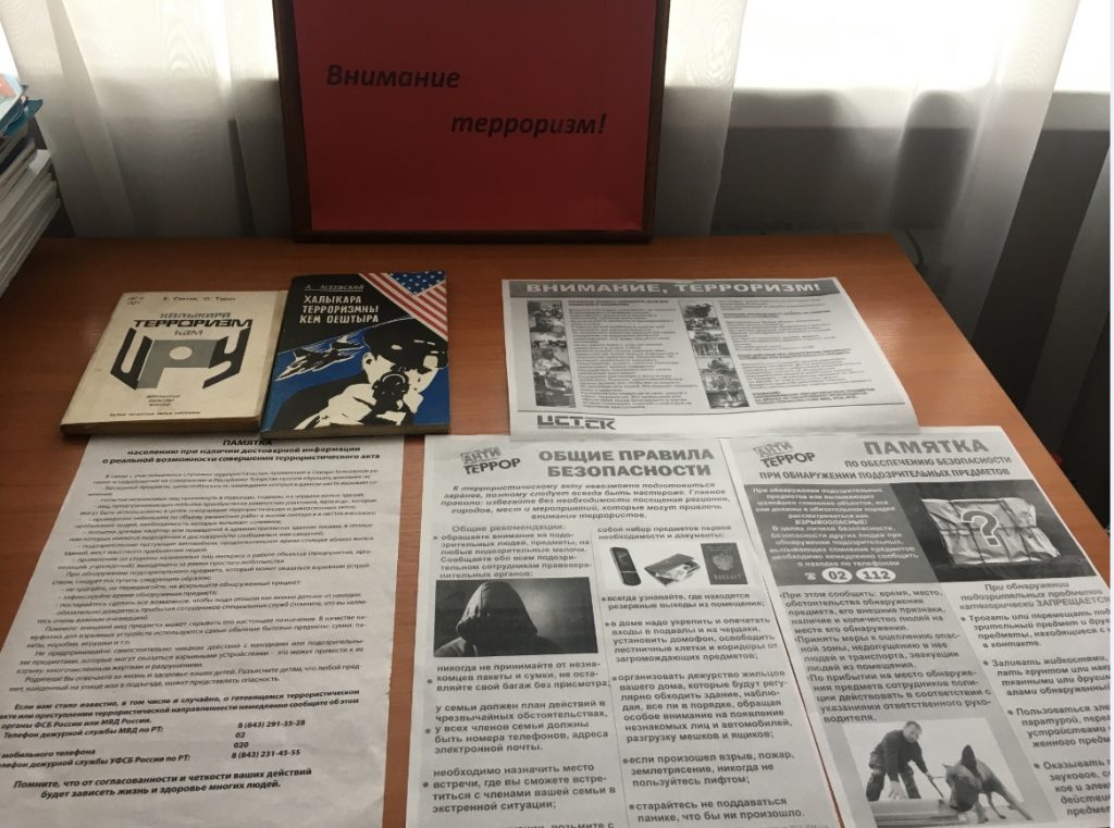 Олы Битаман авылы китапханәсендә тематик күргәзмә оештырылды, ул китап укучыларны Россиядәге һәм дөньядагы терактлар, вакыйгалар хроникасы һәм террорчылыкка каршы көрәш чараларын тасвирлаучы басмалар белән таныштыра. Күргәзмәгә шулай ук «Террорчылык. Гомуми куркынычсызлык кагыйдәләре» дигән белешмәлекләр дә куелды. Мәгълүмат катлаулы һәм куркыныч вәзгыятьтә дөрес карарлар кабул итәргә, бәладән качарга, үз гомереңне һәм башка кешеләрнең гомерләрен саклап калырга ярдәм итә. Күргәзмә киң кулланучылар даирәсенә адреслана. Күргәзмә һәркемнең уяулыгы, җаваплылыгы террорчылыкка каршы чаралар арсеналы булуын искәртә. Террорчылыкка каршы көрәшү генә түгел, ә аның барлыкка килүен кисәтү дә кирәк.
