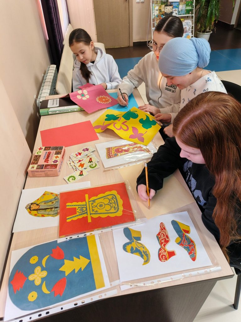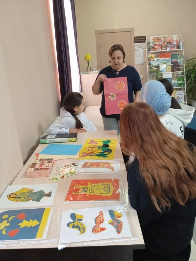 Казаклар авыл китапханәсендә «Күңел бизәкләре»исем астында татар бизәкләре(орнаментлары) белән танышуны дәвам итү өчен чара үткәрергә җыелдык. «Күңел бизәкләре» дип аталган чара яшь буын өчен, татар орнаментларының мавыктыргыч дөньясын ачачак. Татар орнаментлары бик күп эйберләрне бизәгән һәм бизәвен дәвам итә,аларның һәрберсе халык күңеленең бер өлешен йөртә.Мәсәлән:милли кием:түбәтәй,күлмәк-яулыклар,камзул болар барысыда чигеп эшләнгән.Көнкүреш әйберләр:сөлге,ашъяулык,савыт-сабаларда матур итеп татар орнаментлары белән рәсем ясалган.Китапханәче укучыларга кыскача татар халкы орнаментлары тарихы белән таныштырып үтте,аннан татар халык җыры «Сөлге чигәм» җырын тыңладык,ахырда кукчылар үзләре татар орнаментларын кулланып матур рәсемнәр ясадылар.