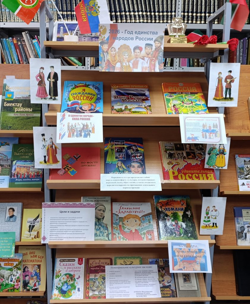 2026 ел Россия халыкларының бердәмлеге елы дип игълан ителде. Бердәмлек елының төп максаты-күпмилләтле Россия территориясендә яшәүче барлык халыклар арасында дуслыкны, үзара аңлашуны һәм бердәмлекне ныгыту. Биектау авылы китапханәсендә «Халыклар дуслыгында – илнең бердәмлеге» исемле китап күргәзмәсе оештырылды. Күргәзмәдә Россиядә яшәүче халыкларның мирасын һәм гореф-гадәтләрен, аның мәдәниятен һәм үзенчәлеген ачучы китаплар тәкъдим ителде. Күргәзмәнең аерым бер өлеше Россия халыкларының әкиятләренә багышланган, алар Ватаныбызның төрле этник төркемнәренең көнкүреше һәм гореф-гадәтләре белән танышырга мөмкинлек бирә.