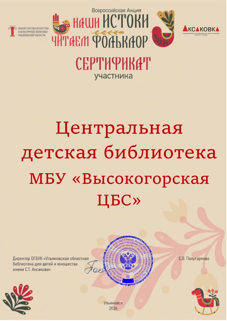 Үзәк балалар китапханәсе « Безнең чыганаклар. Фольклорны укыйбыз» акциясендә катнашты.  Акциянең максаты яшь буынга фольклорны өйрәнү һәм популярлаштыру юлы белән төрле халык, мәдәният, башка вәкилләргә карата ихтирам һәм игелек тәрбияләү. Оештыручысы ОГБУК «С.Т. Аксаков исемендәге Ульяновск өлкә балалар һәм яшүсмерләр китапханәсе».